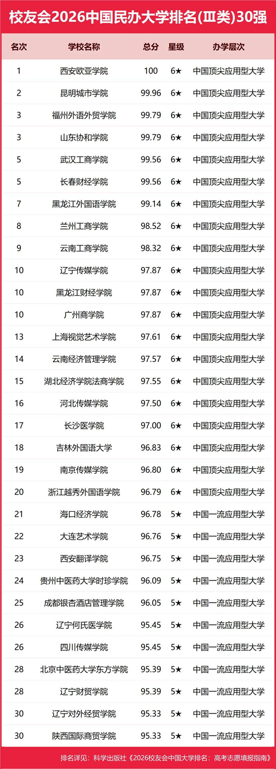 中國(guó)民辦高校按照研究型和應(yīng)用型2個(gè)類(lèi)型進(jìn)行評(píng)價(jià),西湖大學(xué)、武昌首義學(xué)院、三亞學(xué)院、西安歐亞學(xué)院、廣州南方學(xué)院雄居校友會(huì)2026中國(guó)民辦大學(xué)排名第一。西交利物浦大學(xué)、寧波諾丁漢大學(xué)與香港中文大學(xué)(深圳)雄居校友會(huì)2026中國(guó)合作辦學(xué)大學(xué)排名前3強(qiáng)。