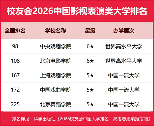| 校友會2026中國影視表演類大學(xué)排名,中央戲劇學(xué)院、青島電影學(xué)院、廣東亞視演藝職業(yè)學(xué)院第一 |