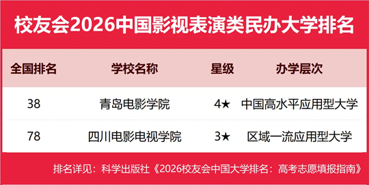 青島電影學(xué)院雄居2026中國影視表演類民辦大學(xué)排名第一,四川電影電視學(xué)院躋身前10強