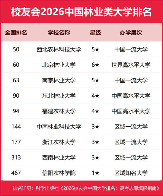 榜單顯示,西北農(nóng)林科技大學(xué)問(wèn)鼎校友會(huì)2026中國(guó)林業(yè)類(lèi)大學(xué)排名首位,甘肅林業(yè)職業(yè)技術(shù)大學(xué)位居2026中國(guó)林業(yè)類(lèi)職業(yè)技術(shù)大學(xué)排名榜首,云南林業(yè)職業(yè)技術(shù)學(xué)院?jiǎn)柖?026中國(guó)林業(yè)類(lèi)高職院校排名冠軍。