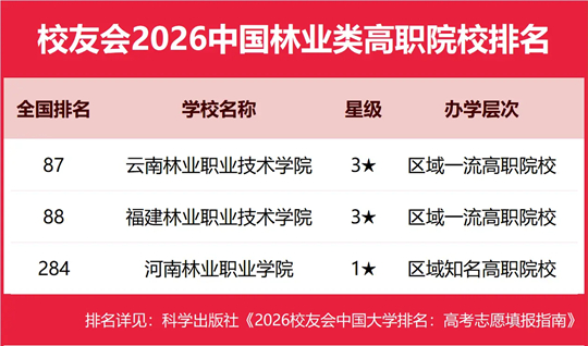 在校友會(huì)2026中國(guó)高職院校排名中,云南林業(yè)職業(yè)技術(shù)學(xué)院全國(guó)排名第87名,雄居2026中國(guó)林業(yè)類(lèi)高職院校排名第一。福建林業(yè)職業(yè)技術(shù)學(xué)院第2,河南林業(yè)職業(yè)學(xué)院第3。