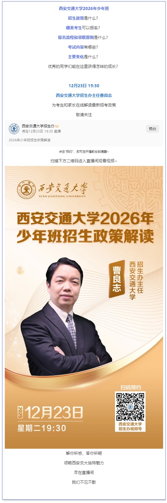 直播預(yù)告丨西安交通大學(xué)招辦主任權(quán)威解讀2026年少年班招生政策(12月23日 19:30)