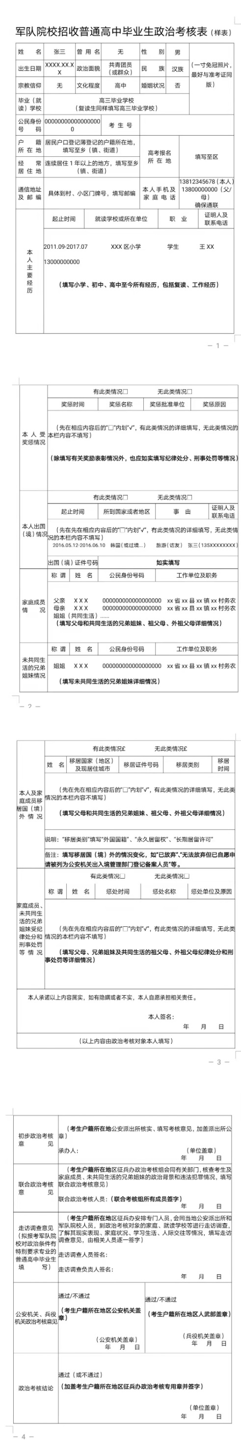 1.考生可從天津市“招考資訊網(wǎng)”(www.zhaokao.net)自行下載打印或從區(qū)兵役機關(guān)(區(qū)人民武裝部,下同)領(lǐng)取《軍隊院校招收普通高中畢業(yè)生政治考核表》(以下簡稱《政治考核表》),規(guī)范填寫個人信息。(下拉底部鏈接可下載電子版)