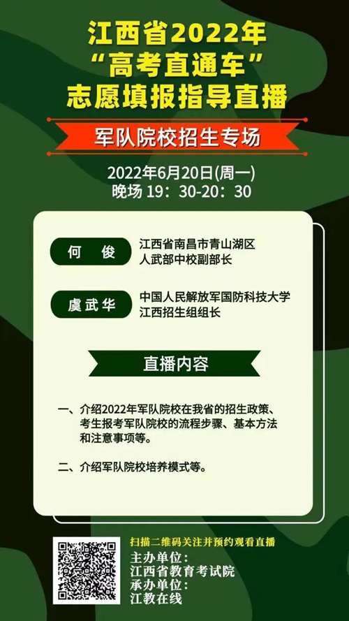 | 如何報(bào)考軍校?江西省教育考試院2022年“高考直通車”志愿填報(bào)指導(dǎo)首場(chǎng)直播來(lái)啦 |