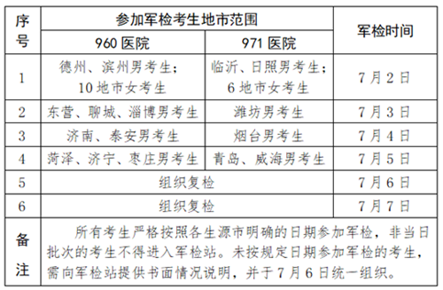 全省共設(shè)2個軍檢站,第一軍檢站在聯(lián)勤保障部隊960醫(yī)院南院區(qū)(濟(jì)南市天橋區(qū)無影山路25號),主要負(fù)責(zé)濟(jì)南、淄博、棗莊、東營、濟(jì)寧、泰安、德州、濱州、聊城和菏澤10地市考生;第二軍檢站在海軍971醫(yī)院(青島市市南區(qū)閩江路22號),主要負(fù)責(zé)青島、煙臺、濰坊、臨沂、威海和日照6地市考生。軍檢時間安排在7月2日至7月5日,7月6日、7月7日統(tǒng)一組織復(fù)檢。參加軍檢考生需7:00前到達(dá)軍檢站。