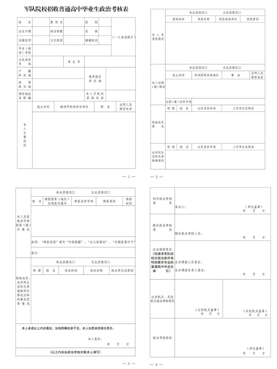 完成網(wǎng)上意向登記考生,須于5月20日至6月12日期間,通過本人就讀學(xué)校教務(wù)部門領(lǐng)取并填寫《軍隊院校招收普通高中畢業(yè)生政治考核表》(以下簡稱《政治考核表》詳見下方),按要求填寫后上交本校教務(wù)部門;學(xué)校匯總本校所有《政治考核表》交本區(qū)招生考試機構(gòu);6月12日前,各區(qū)招生考試機構(gòu)將《政治考核表》交所在區(qū)征兵辦。6月25日至26日,各區(qū)征兵辦通知考生政治考核結(jié)果。