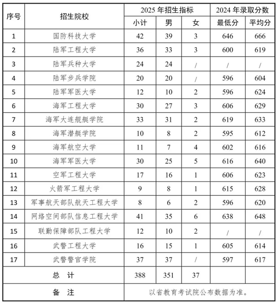 招生計(jì)劃:今年,國(guó)防科技大學(xué)、陸軍工程大學(xué)、陸軍兵種大學(xué)等17所軍隊(duì)院校在我省招生388人,其中男生351人、女生37人。具體專業(yè)招生計(jì)劃、選考科目及體格檢查標(biāo)準(zhǔn)等,在6月份省教育考試院編印的《2025年普通高校招生計(jì)劃》中統(tǒng)一公布。