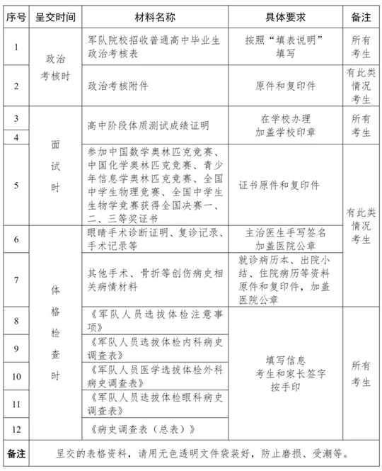五、放棄政治考核。7月2日20時(shí)前,主動(dòng)放棄政治考核的考生,由本人到政治考核所在地縣(市、區(qū))人武部呈送書面申請(qǐng),說明放棄理由、作出不反悔承諾,由本人和家長(zhǎng)共同簽字,申請(qǐng)書背面復(fù)印考生和家長(zhǎng)身份證,逾期影響其他高校錄取。放棄政治考核考生,不得參加面試和體檢。