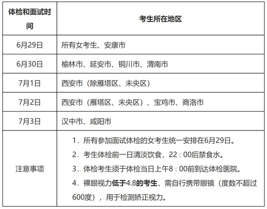 6月29日至7月3日,同步展開面試和體格檢查。由省軍區(qū)招生工作辦公室牽頭協(xié)調(diào),依托空軍軍醫(yī)大學(xué)組織實施,承檢醫(yī)療機(jī)構(gòu)為空軍第九八六醫(yī)院(北區(qū)),地址為西安市碑林區(qū)友誼東路269號。參加面試、體格檢查的考生須攜帶第二代居民身份證、準(zhǔn)考證、學(xué)籍所在高中出具的高中階段體質(zhì)測試及格證明(即高中階段《國家學(xué)生體質(zhì)健康標(biāo)準(zhǔn)》登記卡)。參檢前請認(rèn)真閱讀《體檢須知》(見附件1)。