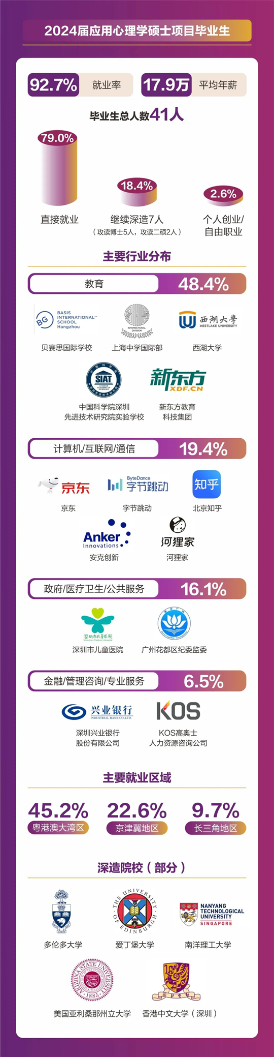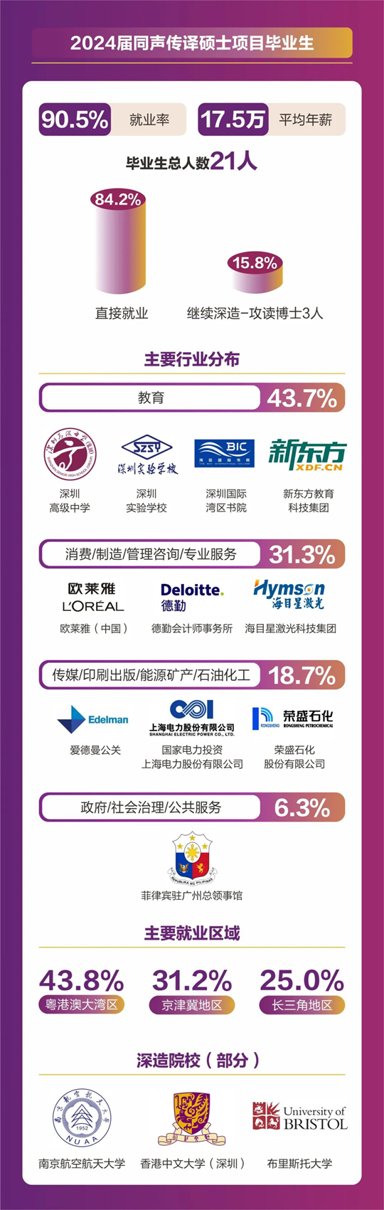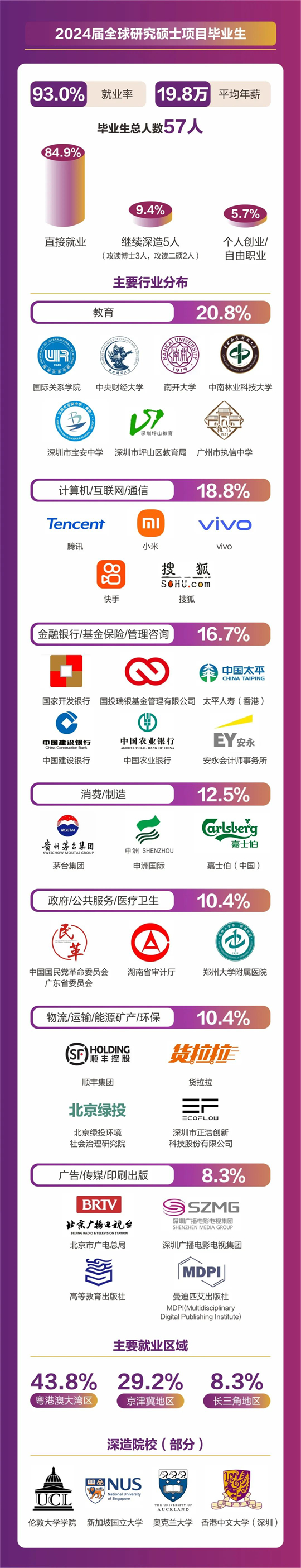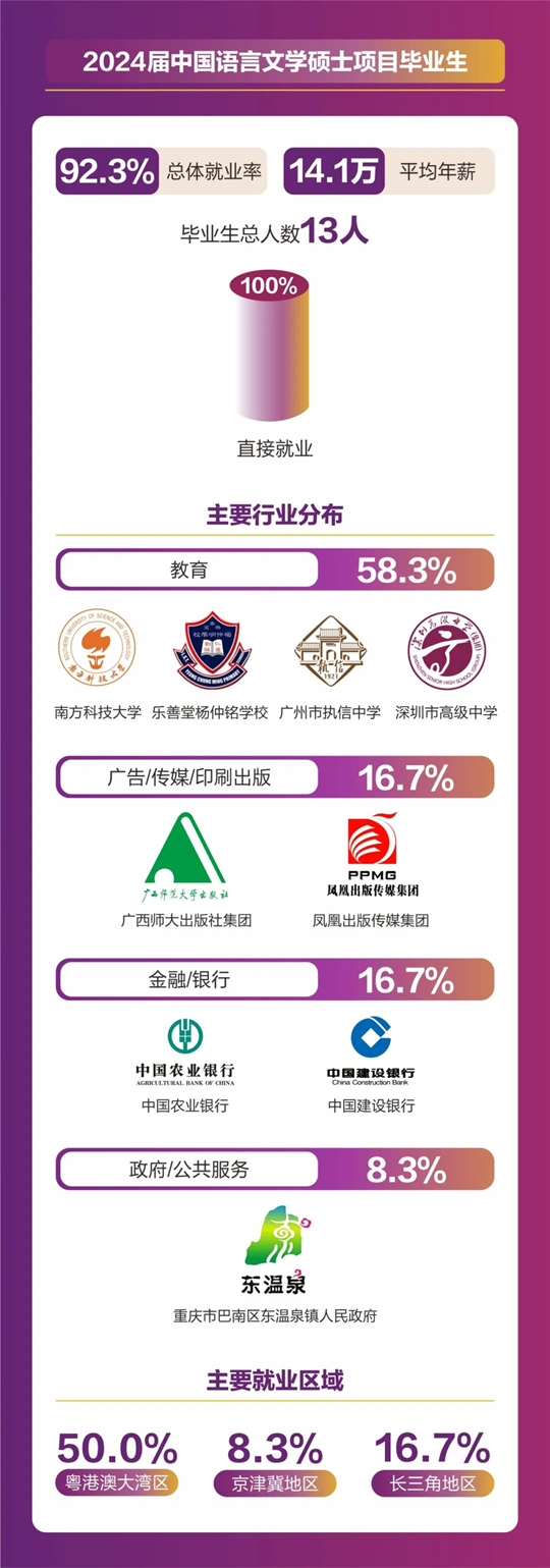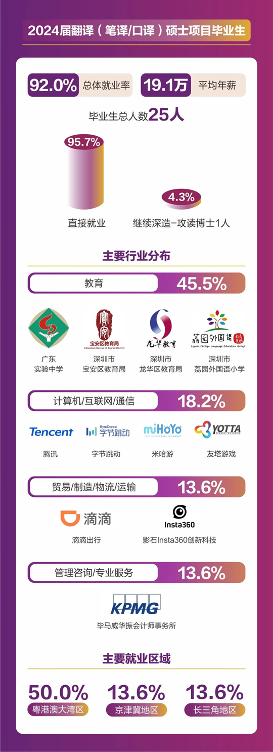 人文社科學(xué)院碩士畢業(yè)人數(shù)共計157人,分別來自翻譯(筆譯/口譯)、同聲傳譯、應(yīng)用心理學(xué)、全球研究、中國語言文學(xué)等5個碩士項目。2024屆碩士畢業(yè)生總體就業(yè)率達(dá)到92.36%,平均年薪為18. 4萬元。其中86.2%畢業(yè)生選擇直接就業(yè),畢業(yè)生就業(yè)行業(yè)分布廣泛,涵蓋了教育、計算機(jī)/互聯(lián)網(wǎng)/通信、貿(mào)易/消費/制造/營運(yùn)、金融/銀行/證券/基金、政府/社會治理/公共服務(wù)、廣告/傳媒/印刷出版、管理咨詢/專業(yè)服務(wù)、能源礦產(chǎn)/石油化工/環(huán)保、醫(yī)藥生物/醫(yī)療衛(wèi)生、物流/運(yùn)輸?shù)榷鄠行業(yè)領(lǐng)域。就業(yè)地點主要集中在粵港澳大灣區(qū)、京津冀區(qū)以及長三角地區(qū)等一線城市及生活圈。11%的學(xué)生則選擇繼續(xù)深造,其中12人將在境內(nèi)外知名院校攻讀博士學(xué)位。