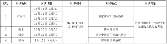 (二)預(yù)選初檢:登錄“國航招飛管理平臺”填寫信息、預(yù)約場次,已預(yù)約考生嚴(yán)格按照預(yù)約時間參加國航招飛辦公室組織的現(xiàn)場初檢面試(含飛行職業(yè)能力傾向測試、英語測試、面試等);
