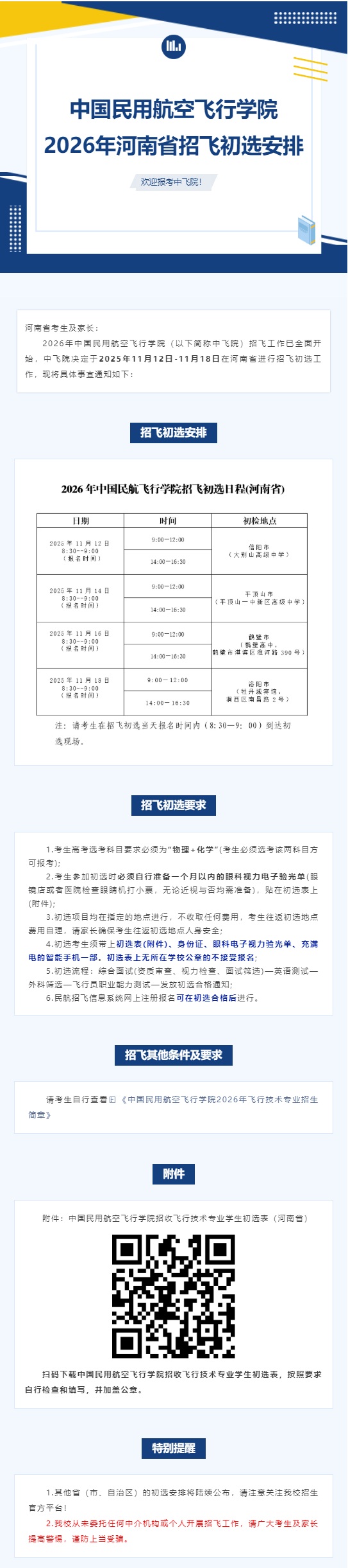 中國(guó)民用航空飛行學(xué)院2026年河南省招飛初選安排