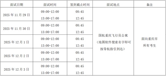 1.僅接受參加國航重慶地區(qū)線上初檢合格且在國航招飛管理平臺完成面試預(yù)約的考生參加面試,面試流程為:簽到(預(yù)約時間前15分鐘停止簽到)—身高體重復(fù)測—飛行職業(yè)能力傾向測試—英語能力測試—集中面試,每名考生考核及等候時間約為4小時,請考生合理安排出行計劃。