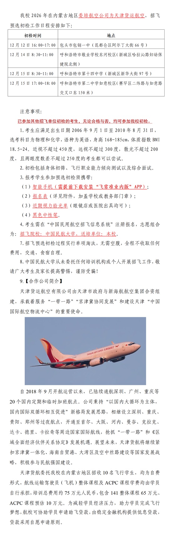中國(guó)民航大學(xué)內(nèi)蒙古地區(qū)2026年招飛預(yù)選初檢日程安排