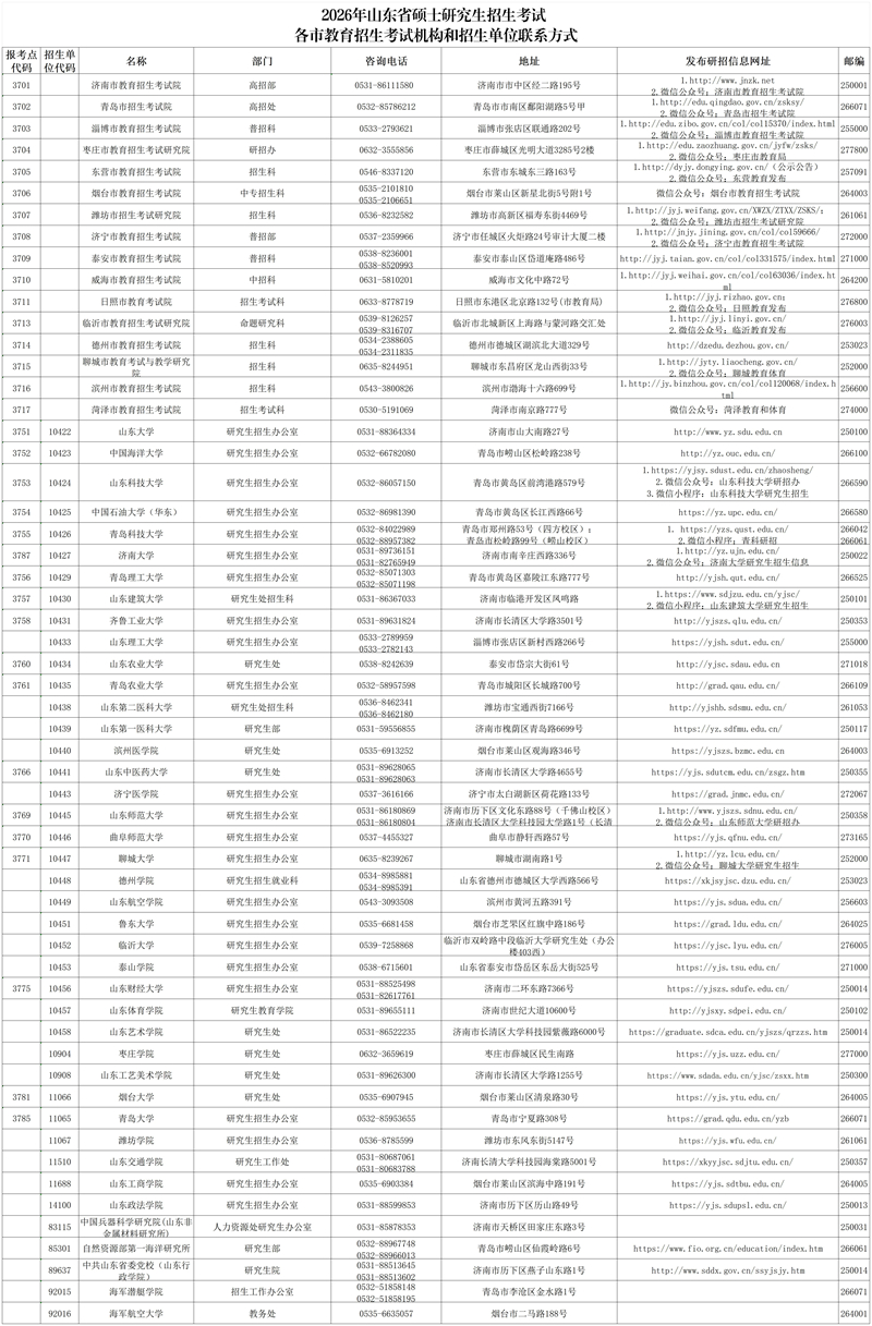 | 2026年山東省碩士研究生招生考試各市教育招生考試機構及招生單位聯(lián)系方式 |