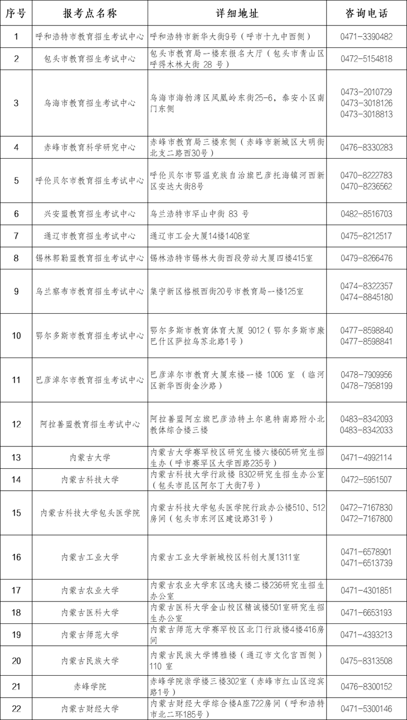 | 2026年全國碩士研究生招生考試內(nèi)蒙古自治區(qū)報考點名稱、地址、咨詢電話 |