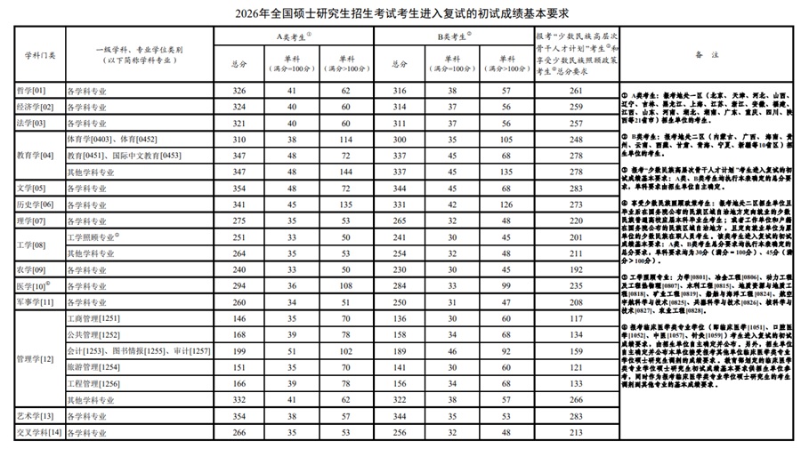 | 2026年全國(guó)碩士研究生招生考試考生進(jìn)入復(fù)試的初試成績(jī)基本要求(國(guó)家分?jǐn)?shù)線) |