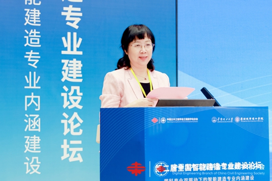 廣州城市理工學(xué)院校長(zhǎng)蘇成教授擔(dān)任組織委員會(huì)主席,土木工程學(xué)院院長(zhǎng)季靜教授、副院長(zhǎng)苑苗苗副教授擔(dān)任組織委員會(huì)副主席,充分展現(xiàn)了學(xué)校在智能建造領(lǐng)域的學(xué)術(shù)影響力和組織能力。論壇以“學(xué)科產(chǎn)業(yè)雙驅(qū)動(dòng)下的智能建造專業(yè)內(nèi)涵建設(shè)”為主題,圍繞智能建造辦學(xué)資源的整合與升級(jí)、培養(yǎng)模式的創(chuàng)新與重構(gòu)、第一課堂與第二課堂的交叉與創(chuàng)新等核心議題展開。季靜在開幕式上致辭,她強(qiáng)調(diào)了智能建造對(duì)于推動(dòng)建筑業(yè)轉(zhuǎn)型升級(jí)的重要性,表達(dá)了對(duì)論壇成功舉辦的期許。