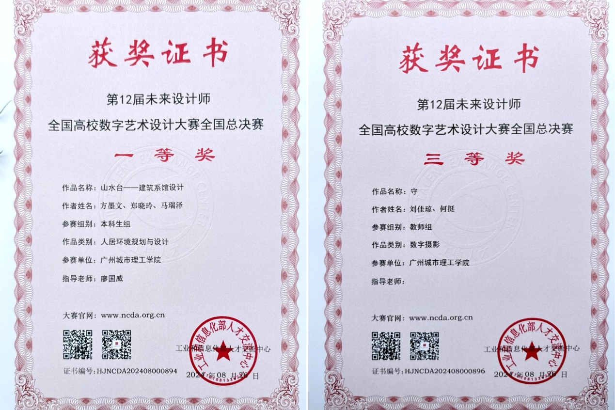 11月16日,第12屆未來(lái)設(shè)計(jì)教育論壇暨未來(lái)設(shè)計(jì)師∙全國(guó)高校數(shù)字藝術(shù)設(shè)計(jì)大賽(NCDA)和未來(lái)設(shè)計(jì)師∙全國(guó)藝術(shù)設(shè)計(jì)教師教學(xué)創(chuàng)新大賽(NDTC)頒獎(jiǎng)典禮在重慶圓滿結(jié)束。廣州城市理工學(xué)院建筑學(xué)院師生代表受邀參加本次活動(dòng),并登臺(tái)領(lǐng)取全國(guó)賽獲獎(jiǎng)獎(jiǎng)項(xiàng)。