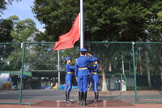 在激昂的國歌聲中,鮮艷的五星紅旗冉冉升起,全體師生面向國旗,莊嚴注目,齊唱國歌。