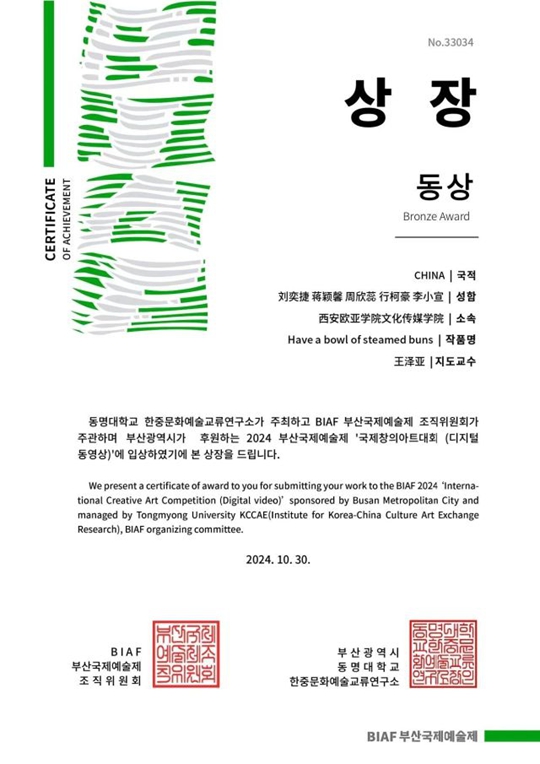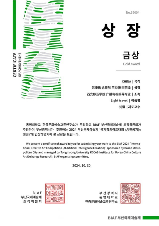 西安歐亞學(xué)院文化傳媒學(xué)院廣播電視編導(dǎo)專業(yè)師生在釜山國際藝術(shù)節(jié)的比拼中斬獲兩金一銀兩銅佳績,他們的作品不僅展現(xiàn)了其在專業(yè)領(lǐng)域的高超技藝,更在文化出海的浪潮中,成為弘揚中國傳統(tǒng)文化的亮麗名片。