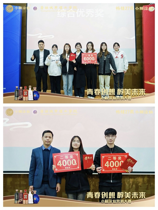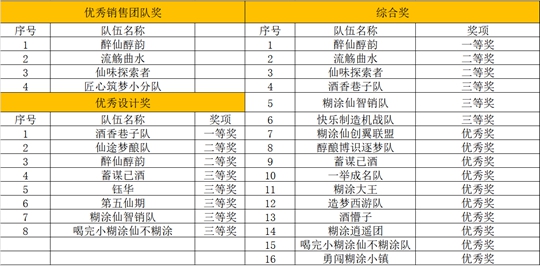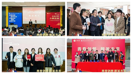 本次大賽自啟動以來,受到了全校師生的廣泛關(guān)注和參與。自10月31日開幕至今,共有59支隊伍300余名同學(xué)報名參賽。決賽評審現(xiàn)場,學(xué)校老師與小糊涂仙酒業(yè)集團代表共同組成的專業(yè)的評審團來到各團隊展位,聽取各參賽隊伍的匯報講解,并圍繞策劃方案、推廣銷售額、實物/電子作品設(shè)計等進行綜合評審打分,最終評選出優(yōu)秀銷售團隊獎、優(yōu)秀設(shè)計獎、綜合獎,共28個獎項。
