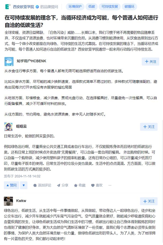 就像同學(xué)們在參與知乎攤位的環(huán)保問答中所寫下的,“購物盡量隨身攜帶布袋子,少用塑料袋“”飲食盡量選擇堂食,少打包”“選擇款式簡單不易過時(shí)的衣服,減少換新速度”……每一個微小改變,都是在向綠色、可持續(xù)的生活方式靠攏。