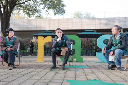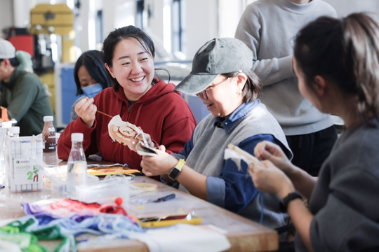 11月20日下午,王佳和高原老師還發(fā)起了一場環(huán)保共創(chuàng)的“舊布新生”循環(huán)工坊,LocalLand組織的“小布”騎友們和歐亞師生等十余人,拿起提前繪制了卡通動畫形象、肉夾饃、小貓小狗等圖案印花的舊布,全身心地投入到掛件、冰箱貼、布偶的制作中。兩個多小時(shí)里,大家一針一線縫制,小心翼翼裁剪,共同感受從零開始的手工樂趣!斑@是我最近最放松最專注的時(shí)候了!币晃粎⑴c者感慨道。