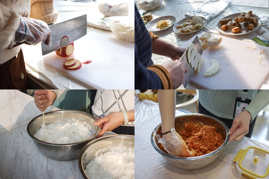 用清水洗干凈浸泡了一天一夜的大白菜,擰干水分。白蘿卜、梨與蘋果切絲,和煮好的糯米、辣椒面混合,攪拌成豐富佐料,將其均勻涂抹在白菜正反兩面后裝瓶,等待20多天的自然發(fā)酵后,就可以食用了。
