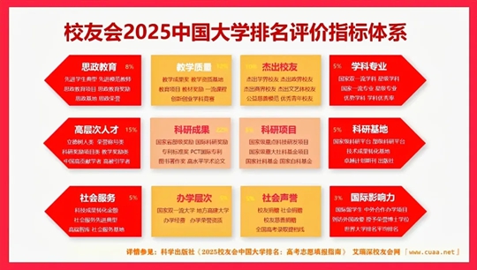 校友會2025中國大學(xué)排名評價指標(biāo)體系由辦學(xué)層次、思政教育、教學(xué)質(zhì)量、杰出校友、高層次人才、學(xué)科專業(yè)、科研項目、科研基地、科研成果、社會服務(wù)、社會聲譽(yù)和國際影響力等12個一級指標(biāo)組成,基于“大平臺、大團(tuán)隊、大項目、大成果、大校友”體系框架展開系統(tǒng)評價,覆蓋的評估指標(biāo)高達(dá)900多項。