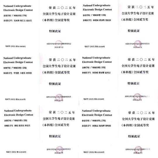 廣州城市理工學(xué)院學(xué)子在2025年全國大學(xué)生電子設(shè)計競賽中獲得全國一等獎1項,全國二等獎5項,省級一等獎11項,省級二等獎6項,省級三等獎7項。國賽成績位列為廣東省本科組第一,省賽成績位列廣東省并列第一,創(chuàng)學(xué)校參賽歷史最好成績。