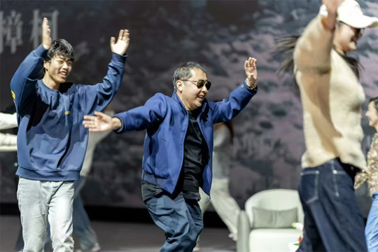 音樂響起,晉中信息學(xué)院學(xué)子為賈導(dǎo)送上一份特別驚喜,以群舞演繹《Go West》,在大家熱烈情緒的感染下,賈樟柯導(dǎo)演起身,加入到大家舞蹈的隊伍之中,全場齊聲三次呼喊的“賈科長,歡迎回家”瞬間將現(xiàn)場氛圍推向高潮。