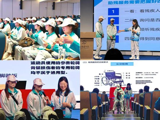 為更好地服務(wù)殘?zhí)貖W會(huì),19名“小海豚”志愿者骨干參加助殘服務(wù)專項(xiàng)培訓(xùn)。他們學(xué)習(xí)了無(wú)障礙溝通技巧、輪椅推行規(guī)范、視障引導(dǎo)方法等專業(yè)知識(shí),更在實(shí)踐中培養(yǎng)了細(xì)致入微的觀察力和同理心。培訓(xùn)結(jié)束后,志愿者骨干將所學(xué)內(nèi)容傳達(dá)給每一名“小海豚”志愿者,全力保障賽事順暢高效開展。