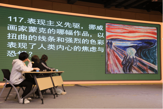 在賽程設計上,賽事分為報名、初賽、決賽三個階段,形成了 “廣泛參與 — 擇優(yōu)晉級 — 巔峰對決” 的科學選拔機制。報名階段通過各院系廣泛動員,最終吸引全校 551 名學子踴躍報名,參賽學生覆蓋各個年級、各個專業(yè),真正實現了美育的全員覆蓋;初賽階段采用線下筆試形式,以客觀題考察學生藝術通識基礎,最終按成績前 20%選拔出 106 名選手晉級決賽;決賽階段在恒友樓 4 樓報告廳舉行,設置個人循環(huán)答題賽、個人搶答賽兩個環(huán)節(jié),從知識儲備、反應速度、能力展現、理解表達等多個維度全方位考察選手的綜合藝術素養(yǎng)。現場選手們反應迅速、爭先搶答的同時沉著應答,既展現了扎實的知識儲備與靈活的應變能力,也讓在場觀賽師生在沉浸式氛圍中同步學習了大量藝術通識知識,實現了 “以賽促學、觀賽受益” 的雙重效果。
