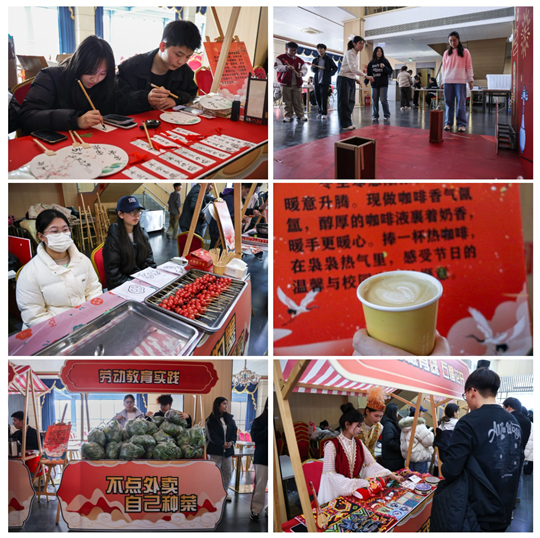 活動創(chuàng)新融合傳統(tǒng)與創(chuàng)意,設(shè)置多個特色集市區(qū)域:書法集市中墨香四溢,同學們揮毫寫下寓意吉祥的對聯(lián);投壺、套圈等趣味游戲讓節(jié)日快樂翻倍;糖葫蘆制作、咖啡體驗區(qū)則充滿煙火氣;勞動教育成果集市里,同學們現(xiàn)場分發(fā)親手種植的青菜;民族體驗區(qū)更讓師生近距離感受少數(shù)民族傳統(tǒng)文化魅力。
