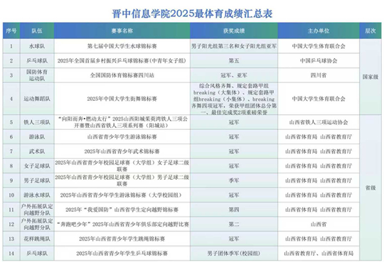 本年度,晉中信息學(xué)院各運動隊在全國及省級賽場上奮勇爭先,在鞏固傳統(tǒng)優(yōu)勢項目的同時,于多個新領(lǐng)域?qū)崿F(xiàn)“破壁”式突破,多項成績創(chuàng)歷史記錄。