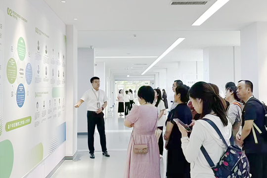 圖五:薛圣澤(左一)為來(lái)訪高中老師介紹人居環(huán)境學(xué)院