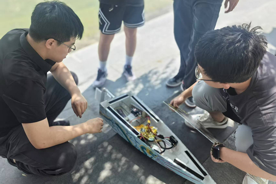圖八:薛圣澤(左一)在混凝土龍舟項(xiàng)目式課堂中指導(dǎo)學(xué)生
