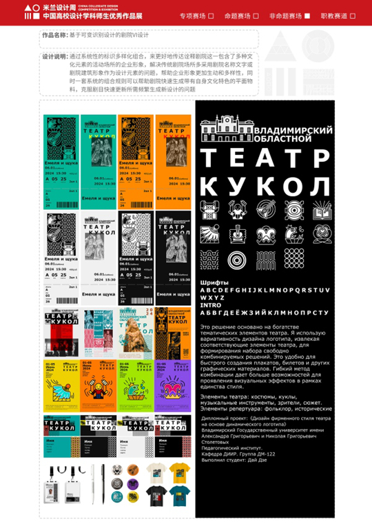 其中,珠寶學(xué)院戴杰老師設(shè)計的《基于可變識別設(shè)計的劇院Ⅵ設(shè)計》斬獲大賽一等獎。該作品通過系統(tǒng)性地標(biāo)識多樣化組合,更好地傳達(dá)詮釋劇院這一包含了多種文化元素的活動場所的企業(yè)形象,解決傳統(tǒng)劇院場所多采用劇院名稱文字或劇院建筑形象作為設(shè)計元素的問題。