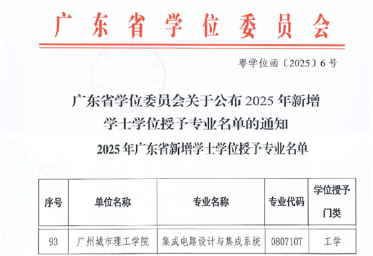 6月12日,廣東省學(xué)位委員會(huì)正式下發(fā)《關(guān)于公布2025年新增學(xué)士學(xué)位授予專(zhuān)業(yè)名單的通知》(粵學(xué)位函〔2025〕6號(hào))。經(jīng)省學(xué)位委員會(huì)確認(rèn),廣州城市理工學(xué)院申報(bào)的集成電路設(shè)計(jì)與集成系統(tǒng)專(zhuān)業(yè)順利通過(guò)備案,獲得學(xué)士學(xué)位授予權(quán)。