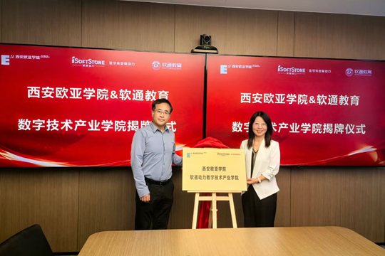 軟通動(dòng)力集團(tuán)高級(jí)副總裁、軟通教育CEO林濤與西安歐亞學(xué)院副校長(zhǎng)張樂(lè)芳共同簽約并為數(shù)字技術(shù)產(chǎn)業(yè)學(xué)院揭牌