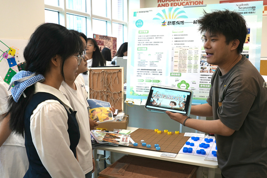 數(shù)科樂育研究中心的展區(qū),在美國哥倫比亞大學(xué)教育博士、臺北教育大學(xué)教授張世宗的指導(dǎo)下,學(xué)生們深入剖析幼兒與小學(xué)階段數(shù)科教育的特點及規(guī)律后,研發(fā)了22項“樂育”玩教具項目,作品涵蓋數(shù)學(xué)和科學(xué)兩方面內(nèi)容,包括撲克牌、骰子、棋類、博弈等游戲,涉及幾何拼圖、勾股定律等內(nèi)容。