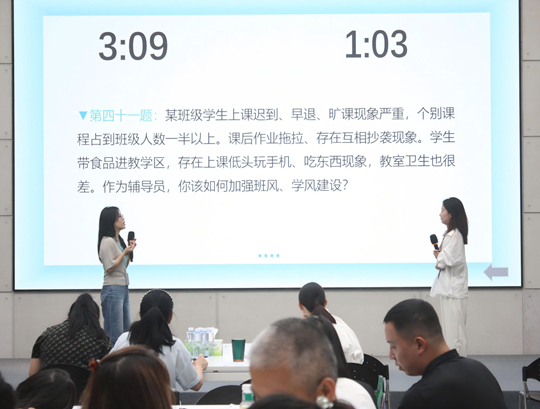 學(xué)情分析環(huán)節(jié)要求輔導(dǎo)員依據(jù)所帶學(xué)生的基本情況、生源背景、學(xué)業(yè)表現(xiàn)等學(xué)情信息,深入剖析群體與個(gè)體問(wèn)題,并提出切實(shí)可行的對(duì)策建議,撰寫(xiě)詳細(xì)的分析報(bào)告,引導(dǎo)輔導(dǎo)員精準(zhǔn)把握學(xué)生狀況,考驗(yàn)輔導(dǎo)員的數(shù)據(jù)處理與分析能力及有效應(yīng)對(duì)潛在風(fēng)險(xiǎn)的能力。案例研討環(huán)節(jié),輔導(dǎo)員們圍繞案例的問(wèn)題本質(zhì)、解決思路、實(shí)施辦法及相關(guān)啟示展開(kāi)討論,憑借扎實(shí)的專(zhuān)業(yè)知識(shí)和豐富的實(shí)踐經(jīng)驗(yàn),充分展現(xiàn)出綜合運(yùn)用理論分析、研判、解決問(wèn)題及應(yīng)急處突的能力。談心談話環(huán)節(jié)同樣精彩,輔導(dǎo)員與助演學(xué)生現(xiàn)場(chǎng)交流,結(jié)束后,需結(jié)合談話情況進(jìn)行簡(jiǎn)短總結(jié),分析問(wèn)題并提出改進(jìn)措施。著重考查了輔導(dǎo)員對(duì)理論政策的掌握、對(duì)學(xué)生特征及成長(zhǎng)成才規(guī)律的把握,以及教育引導(dǎo)、解決實(shí)際問(wèn)題的能力。
