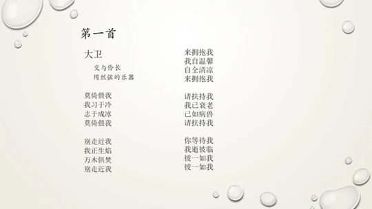 《大衛(wèi)》這首詩(shī)的妙趣,在于“既是《詩(shī)經(jīng)》,又是《圣經(jīng)》”的奇妙互文。童明指出,詩(shī)中“大衛(wèi)”是《圣經(jīng)-詩(shī)篇》的敘述者;副標(biāo)題借用了《詩(shī)篇》的格式,而“絲弦樂(lè)器”帶有中國(guó)民樂(lè)元素。這樣,既保留了大衛(wèi)對(duì)神傾訴的口吻(如《詩(shī)篇》中“我的上帝,為何遺棄我”的抱怨與依賴(lài)),又注入了東方文化中含蓄的情感表達(dá)(如“我自溫馨,自全清涼”等),兩種文明在同一首詩(shī)里共存,相映成輝。