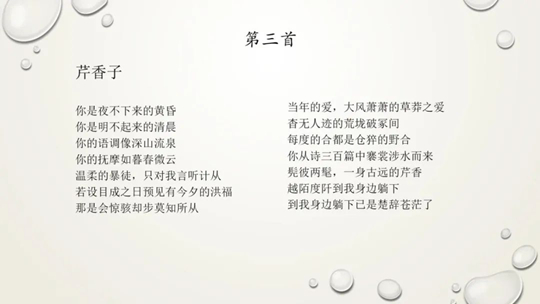 《芹香子》是一首商籟體的情詩(shī),但既不是莎士比亞式的商籟格式(4+4+4=2),也不同于佩脫拉克式的商籟格式(8+6),而是以前后各七行(7+7)的對(duì)照形成獨(dú)特的韻律。童明認(rèn)為,木心的十四行詩(shī),雖然不嚴(yán)格押韻,卻注重內(nèi)在的節(jié)奏律動(dòng)。詩(shī)中“我”大概是女性。對(duì)比《詩(shī)經(jīng)》中“淑女”和“子都”(美男子)之間的情話(huà),木心的“芹香子”是個(gè)新的稱(chēng)謂,取其樸實(shí)和清新。