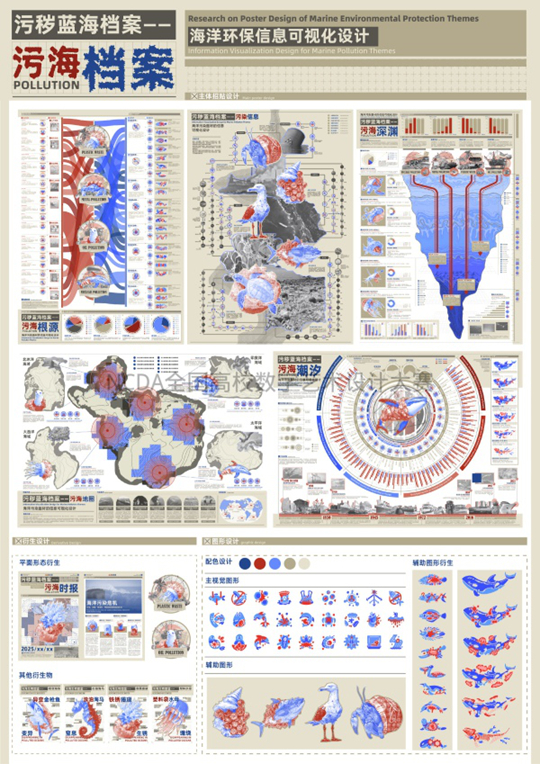 榮獲一等獎的珠寶學(xué)院視覺傳達(dá)設(shè)計專業(yè)學(xué)生王奇瑞、肖利紅提到,她們的獲獎作品《污海檔案》以海洋環(huán)保為主題,采用招貼設(shè)計作為信息傳播的媒介。作品旨在通過圖形化處理海洋環(huán)保相關(guān)元素,強(qiáng)化視覺圖形的信息傳達(dá)性。其設(shè)計運用高對比色彩和張力構(gòu)圖等視覺語言,隱喻環(huán)境污染的嚴(yán)重性,探索通過直觀的視覺沖擊提升公眾的環(huán)保認(rèn)知,借助平面設(shè)計傳播海洋保護(hù)理念,激發(fā)大眾的生態(tài)保護(hù)意識。