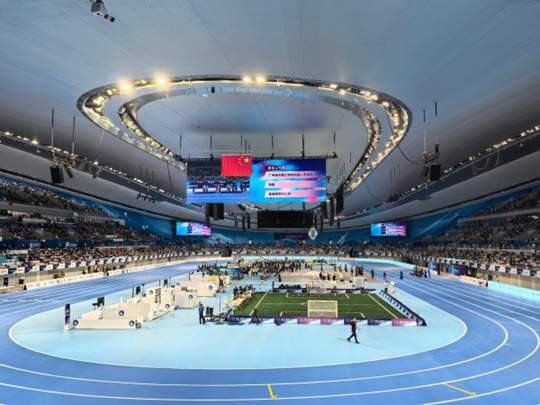 參賽作品以“光影騎樓”劇場嶺南文化為核心創(chuàng)意,通過人形機器人這一載體,打造出沉浸式文化體驗場景。表演中,背景投影生動呈現(xiàn)永慶坊騎樓、陳家祠等嶺南文化地標影像,兩臺nova_1機器人化身“文化使者”:其手臂隨經(jīng)典民樂《彩云追月》的韻律靈動舞動,流蘇裝置模擬水袖之姿,演繹醒獅的剛勁意韻;彩綢裝飾仿錦袍之態(tài),鋪陳出瑞獸獻福的吉祥氣象。這種“文化基因+科技載體”的創(chuàng)新融合,既實現(xiàn)了非遺文化的現(xiàn)代表達與活態(tài)傳承,又呼應了本次運動會“智競向未來”的主題。