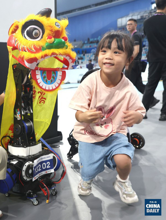 機器人醒獅表演吸引了小朋友的目光(鄒紅 攝)