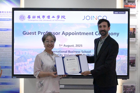 在會談結束前的聘任儀式上,安然代表學院向Tiago Mateus頒發(fā)客座教授聘書。安然表示:“Tiago先生是葡萄牙注冊商貿律師,在國際經貿和法律領域造詣深厚,致力于推動中歐經貿合作與產教融合發(fā)展。今年四月,他受邀參加廣交會調研座談會并發(fā)言,向國家及省市相關領導匯報了與廣州城市理工學院協(xié)同培養(yǎng)國際商科人才的創(chuàng)新模式與實踐成果。他的加入必將為學校應用型人才培養(yǎng)注入新動能。”Tiago Mateus對此表示感謝,并強調:“Joinco將持續(xù)踐行企業(yè)社會責任,加強校企協(xié)同創(chuàng)新,將企業(yè)最新實踐案例引入課堂,助力廣城理培育具有全球勝任力的應用型人才!