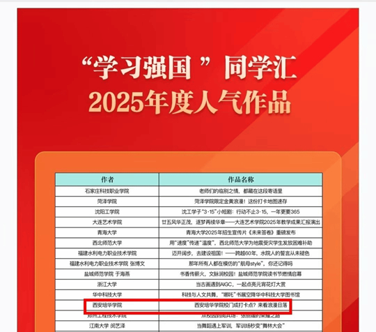 “學(xué)習(xí)強(qiáng)國”同學(xué)匯作為面向全國青年學(xué)子、匯聚高校優(yōu)質(zhì)內(nèi)容的重要平臺,其年度評選旨在表彰在理論宣傳、思想引領(lǐng)、文化傳播等方面表現(xiàn)突出的高校及作品。本次“最具傳播力高!睒s譽,是對西安培華學(xué)院整體網(wǎng)絡(luò)思政工作體系化建設(shè)、常態(tài)化運營及其廣泛社會影響力的高度認(rèn)可。而“年度人氣作品”獎,則直接反映了其內(nèi)容創(chuàng)作緊扣時代脈搏、貼近學(xué)生生活、引發(fā)情感共鳴的強(qiáng)大感染力。